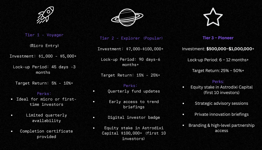 Whether you're a first-time explorer or a pioneering investor, our tiered structure lets you align your capital with your vision, from micro-entry to strategic equity.